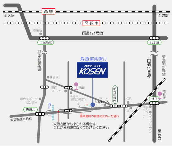 ![]() ◆ お車でお越しの場合 ◆ 大阪高槻京都線(高架道路)の側道に面しているため、店舗前の道が一方通行になっております。 お気をつけてお越しください。 ◆ バスでお越しの場合 ◆ 【高槻市営バス】 JR高槻駅、阪急高槻市駅より「下田部団地」行き乗車、「西冠」バス停下車、徒歩3分 【京阪バス】 JR高槻駅、阪急高槻市駅より「枚方市駅」行き乗車、または、 京阪枚方市駅より「JR高槻」行き、または「阪急高槻」行き乗車、「南辻子」バス停下車、徒歩15分 |
